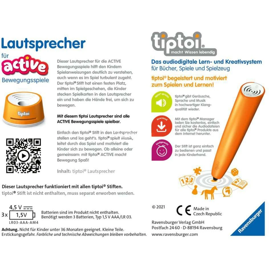| Weitere Informationen | Mit, dem, tiptoi, Lautsprecher, können, alle, Spiele, der, ACTIVE, Reihe, gespielt, werden, Dieser, Lautsprecher, funktioniert, mit, allen, tiptoi-Stiften. |