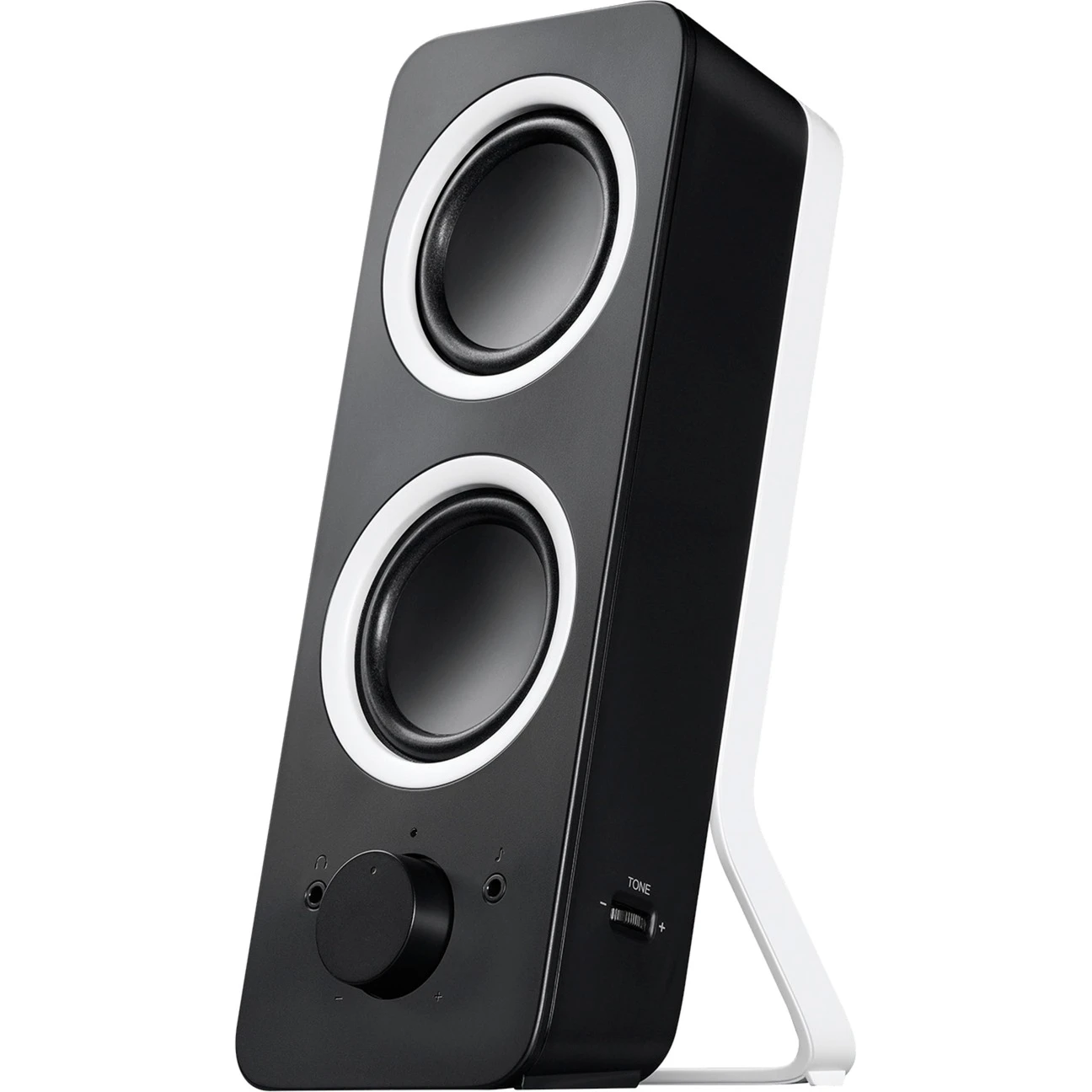 Bei dem Z200 von Logitech handelt es sich um einen Multimedia Speaker. Diese 2.0-Lautsprecher mit 10 Watt Spitzenleistung bieten vollen, klaren Stereoklang und einen raumfüllenden Sound. An der Vorderseite befinden sich der Ein-/Ausschalter, der gleichzeitig auch der Lautstärkeregler ist, sowie eine Kopfhörerbuchse und einen Aux-Eingang. Für kräftigere Tiefen dreht man einfach an dem Klangregler, an der Seite des Z200 von Logitech.